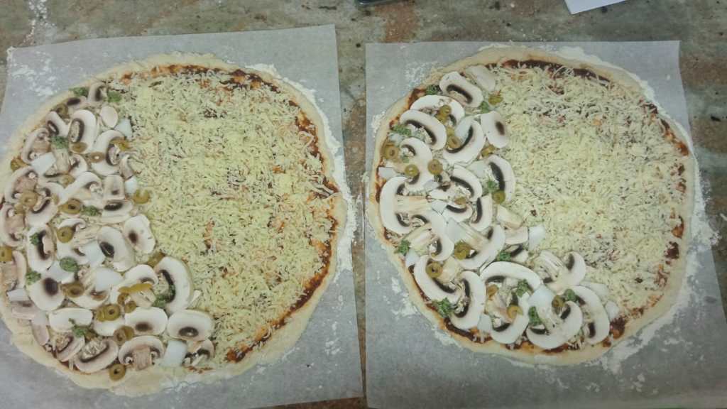 Our tomato sauce recipe (for two) is something like this: one can of chopped tomatoes, a big squirt of ketchup, and a big squirt of tomato paste which does a nice job of thickening up the juice in the canned tomatoes. Add in herbs and dried turmeric, bring to a bubbling boil, then turn down and stir to stop sticking until thickened. Put on the pizza bases and then the ‘toppings’.