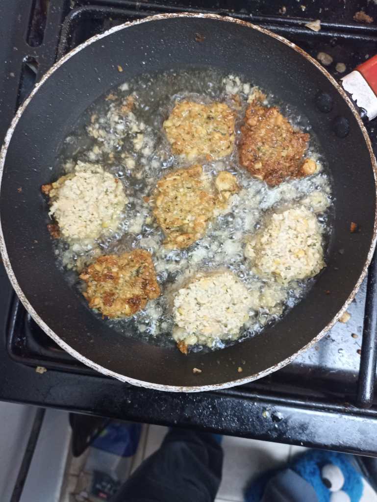 Since prepping the felafel mix is a bit of a patcherei, we process a kilo (or more) of chickpeas at a time and freeze in portions big enough to serve the four of us. Then when we want felafel, we thaw a portion and fry (or bake) it. The recipe below is enough to serve our family about 5 times. Depending on the size of your family, you may get more or fewer meals out of this, but unless you’re feeding an army (or your child’s class), the recipe below will be plenty for several times. Our felafel is vegan and gluten free.