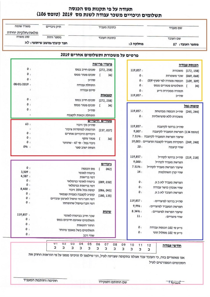 Your employer is required to give you the previous year’s 106 form by the end of March each year. It confirms all of the income you received and serves as a summary of all of your tlushim from that calendar year. This form is most commonly used when filing for a tax refund or for proving your income for things like arnona discounts.